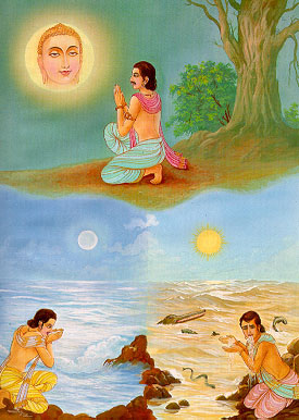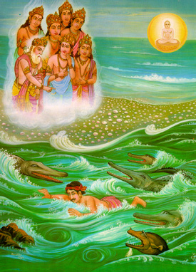 હે ભગવાન! જ્યારે ભયંકર મગરોના ઝૂથ, ભયજનક માછલીઓ અને તોફાની સમુદ્રના ઊંચા તરંગો માણસના જહાજને ઘેરે છે, એવો ખતરનાક સમુદ્રમાં પણ, જે વ્યક્તિ તમારું નામ સ્મરે છે, તે ભયરહિત બની જાય છે અને નિર્વિઘ્ને કિનારે પહોંચી જાય છે.