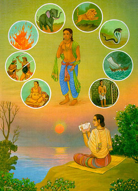 હે નાથ! જે બુદ્ધિશાળી વ્યક્તિ ભક્તિભાવથી આ સ્તોત્રનો સતત પાઠ કરે છે, તે મદોન્મત હાથી, સિંહ, દાવાનળ, સાપ, યુદ્ધ, તોફાન ભરેલા સમુદ્ર, જળોદર રોગ અને કેદખાનું — આવા આઠ પ્રકારના ભયથી પૂર્ણરૂપે મુક્ત રહે છે. સતત તમારું સ્તોત્ર સ્મરણ કરનારની આસપાસ ભય પોતે જ દૂર થઇ જાય છે, અને તે નિર્ભય બની જાય છે.